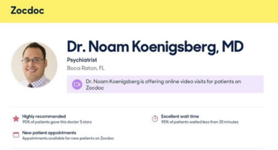 Book your video appointment with Dr. Noam Koenigsberg online today! Dr.Koenigsberg is a concierge psychiatrist that specializes in ADHD and Substance Abuse. He is now seeing patients remotely! Call 305-985-2161 for more information or book directly by clicking the profile below. https://www.zocdoc.com/doctor/noam-koenigsberg-md-128243